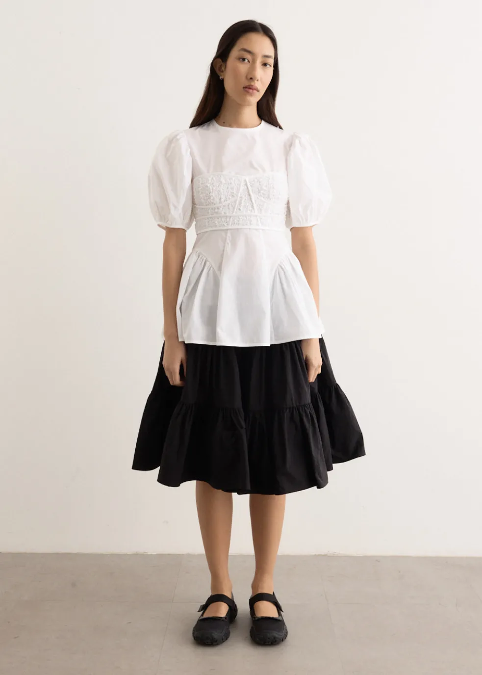 Cecilie Bahnsen, a Danish fashion designer, is renowned for her eponymous brand that blends traditional craftsmanship with contemporary design. Her collections, known for voluminous silhouettes and intricate textures, have earned acclaim for a modern, avant-garde take on femininity. Made from cotton, the Conner top is a patchwork of couture craftsmanship, featuring a fitted smocked cotton bustier bodice, gathered side panels, and signature puff sleeves, all secured with a zipper at the back.