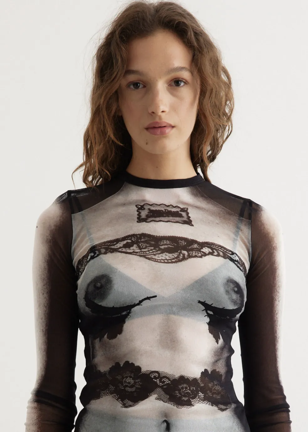 Established in 1976, Jean Paul Gaultier is a trailblazer in the fashion world, known for its bold and comprehensive approach to design. The brand is renowned for its iconic pieces that effortlessly blend sensuality, drama, and sophistication in both ready-to-wear and haute couture collections. The Mesh Long Dress is cut to a maxi length and a slim fit, adorned with an all-over seasonal “Body Lace Mariniere” print.