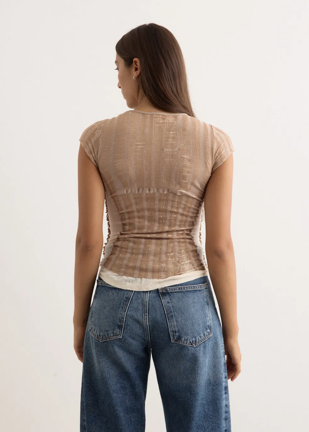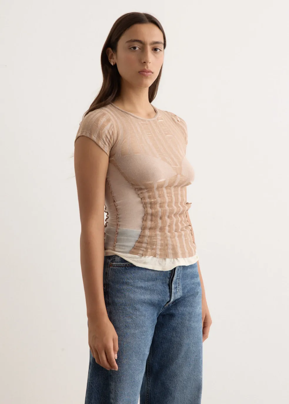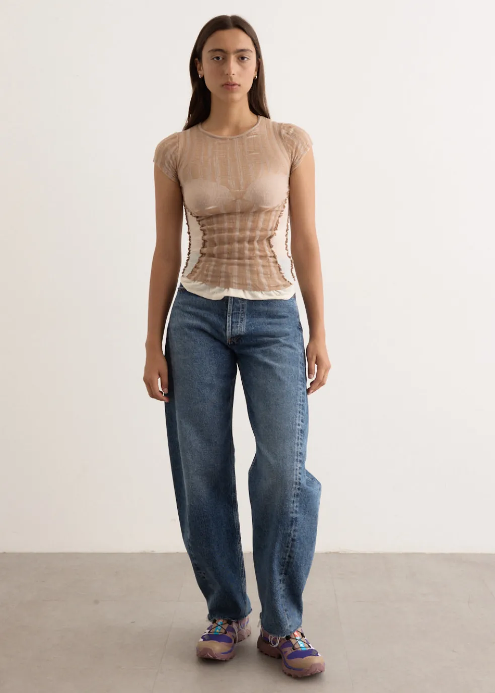 Founded in 1978, Diesel is rooted in denim mastery, known for their nostalgic Y2K-inspired pieces to create a chic yet casual look. Their collections sport denim-heavy designs in their rebellious yet playful collections. Jacquard-knitted from nude yarn for a slim fit that enhances its underwear effect, the Calai Top features an engineered pattern that creates the illusion of a bra. Vertical lines define the waist, while laddered detailing adds Diesel’s signature worn-in look.