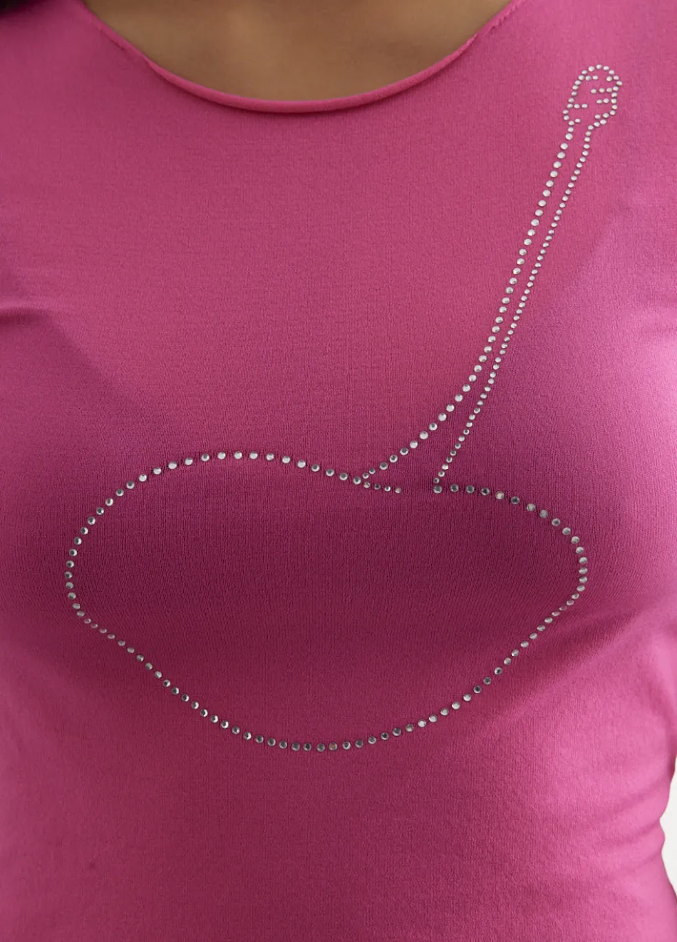 Founded in 2018 by twins Claudia and Sayana Durany, Gimaguas is powered by relationships and conversation. A focus on carefree silhouettes, bespoke prints, technical knitwear and craft-inspired detail. All Gimaguas pieces are designed in Barcelona. Crafted from a stretch polyamide, the Cherry Brillo Top is tailored to a regular fit. Adorned with a shiny rhinestome-embellishment cherry motif at the chest.