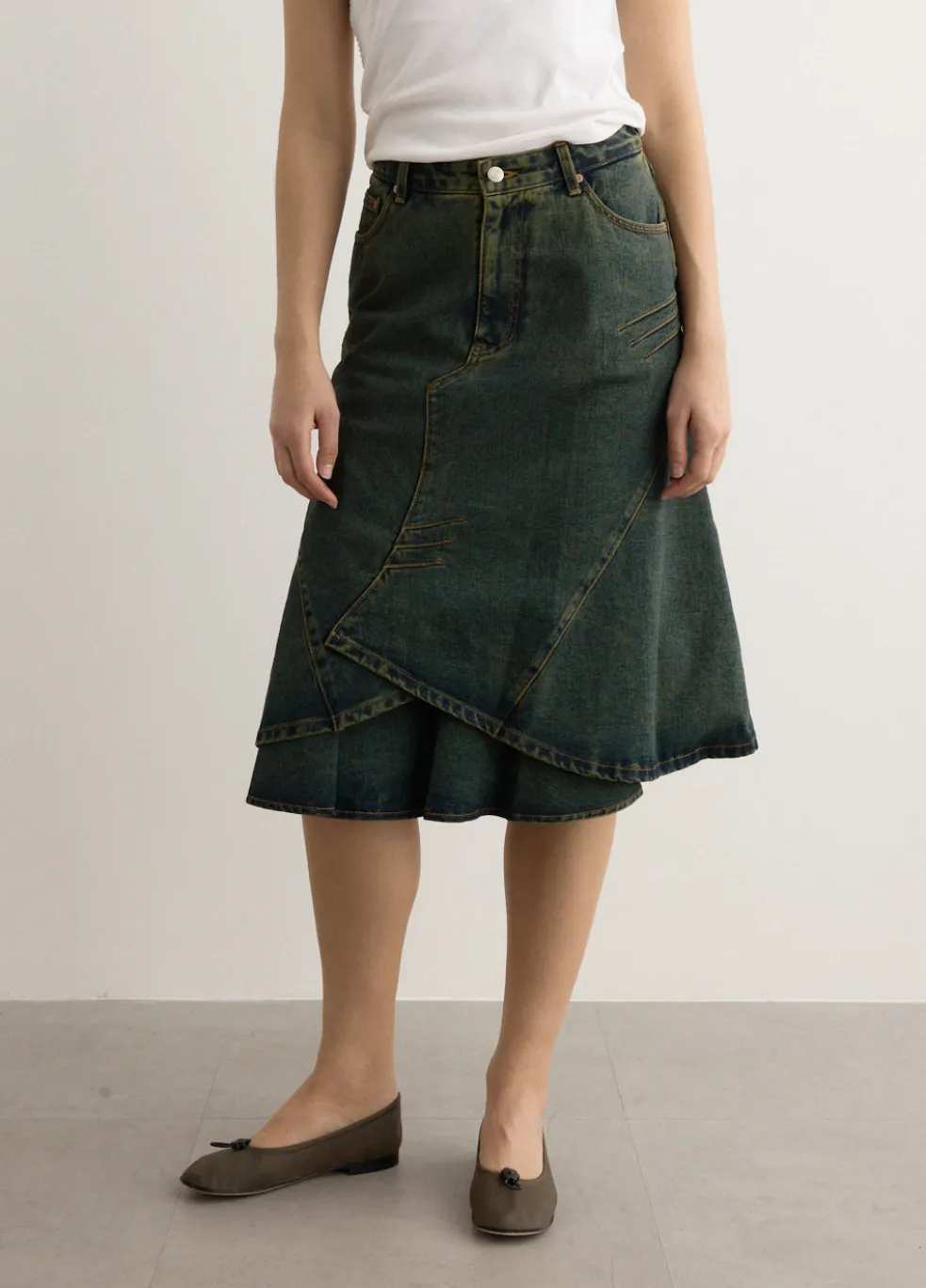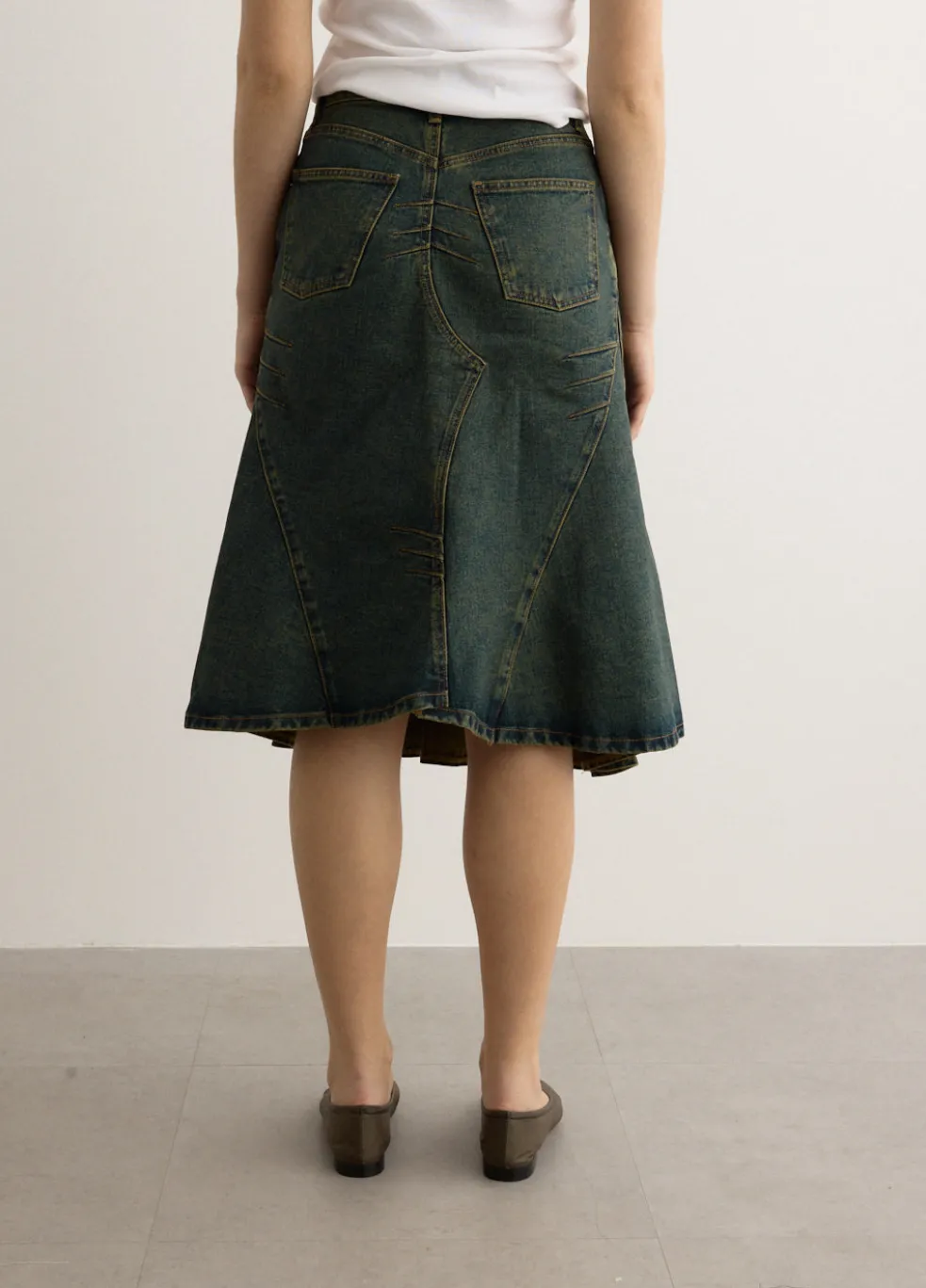 The identity of Andersson Bell was inspired by the merge of two contrasting cultures, reinterpreting Scandinavian aesthetic to create garments from a Korean perspective. The Custom Flare Layered Skirt fuses utilitarian cool with sculptural edge. Crafted in Korea from washed denim, the skirt features asymmetrical panelling, raw seam details, and contrast stitching to create a deconstructed patchwork silhouette. Designed with a high-rise waist, classic five-pocket styling and front button fly for added functionality. A standout addition to any wardrobe, the skirt styles perfectly with oversized knits or structured blazers.