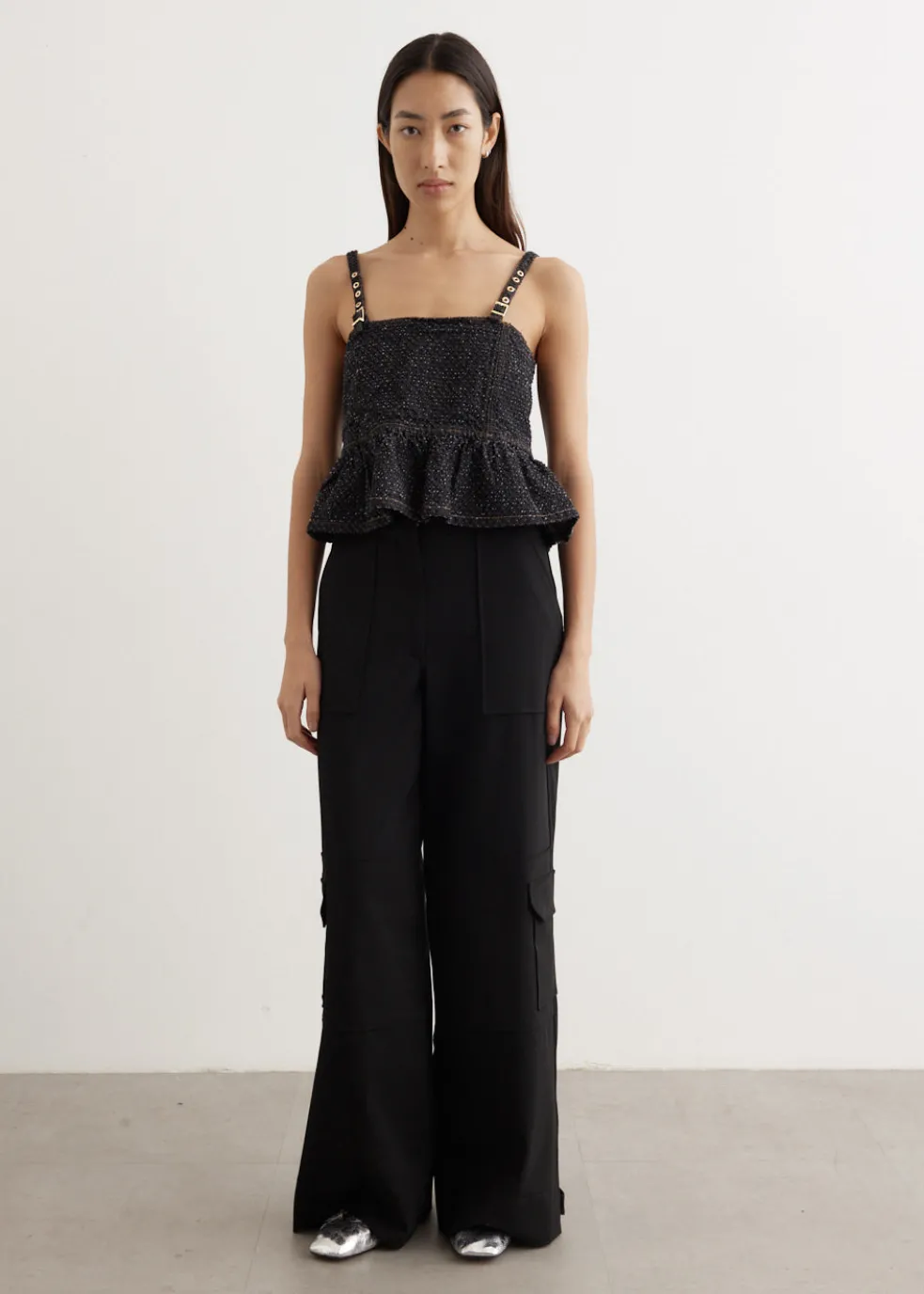 Danish label Ganni blends streetwear trends with a playful touch of humour through bold prints and colour palettes, voluminous silhouettes and easy-to-wear fabrics. Crafted from organic cotton denim with a tweed-like texture, the Fluffy Denim Strap Top features a square neckline, an adjustable strap with gold-tone buckles, shaped to a fitted bodice and a peplum hem for a flattering silhouette.