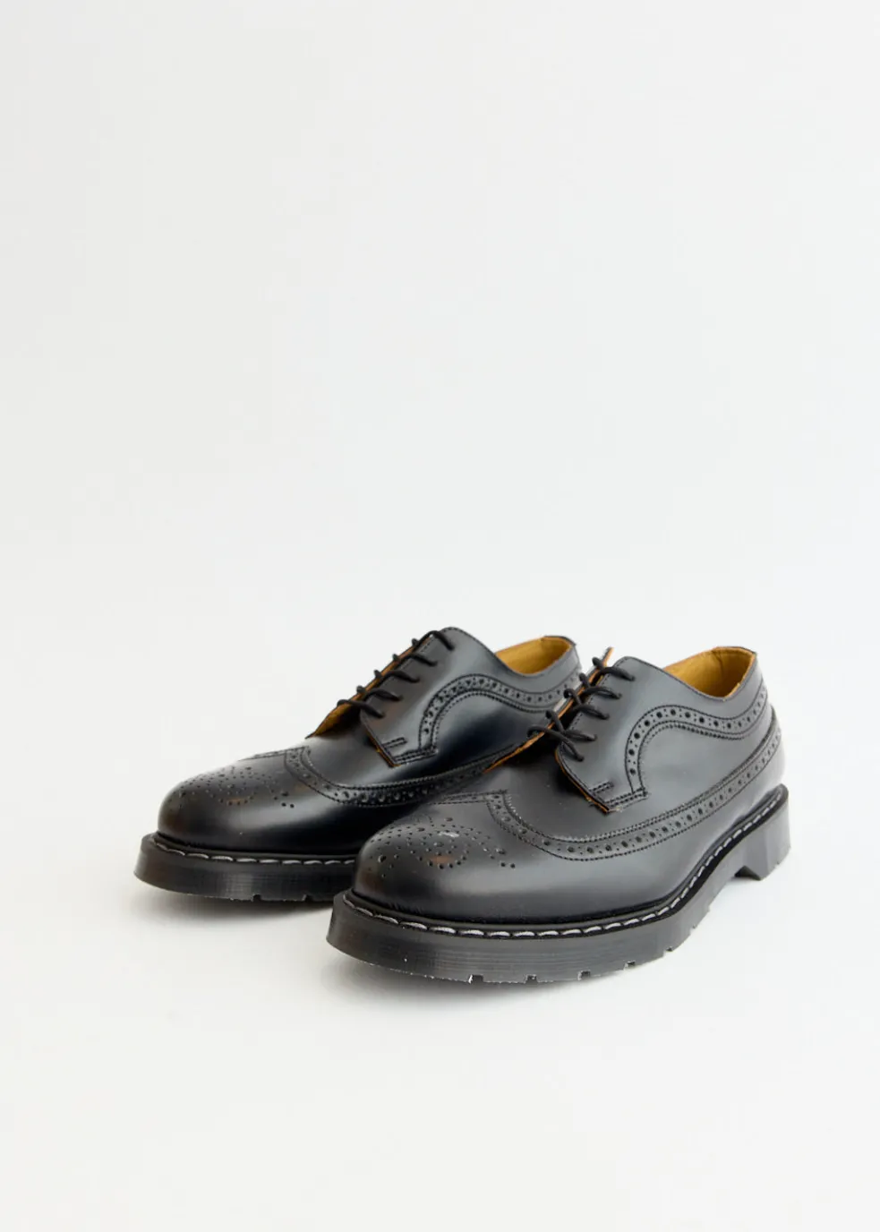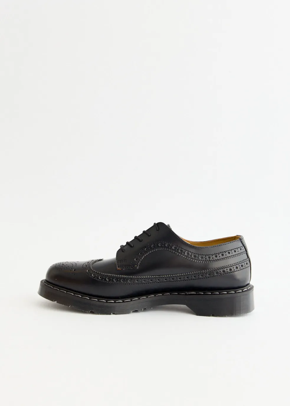 Solovair, founded in Northamptonshire, England in 1881, initially made boots for the British Army before shifting to fashionable, long-lasting footwear. Their unique Goodyear welt method ensures toughness involving stitching a welt and a pre-formed canvas strip onto the insole, showing the brand’s commitment to quality craftsmanship. The Hi-Shine American Brogue Shoes boast a classic derby design with intricate perforated detailing.