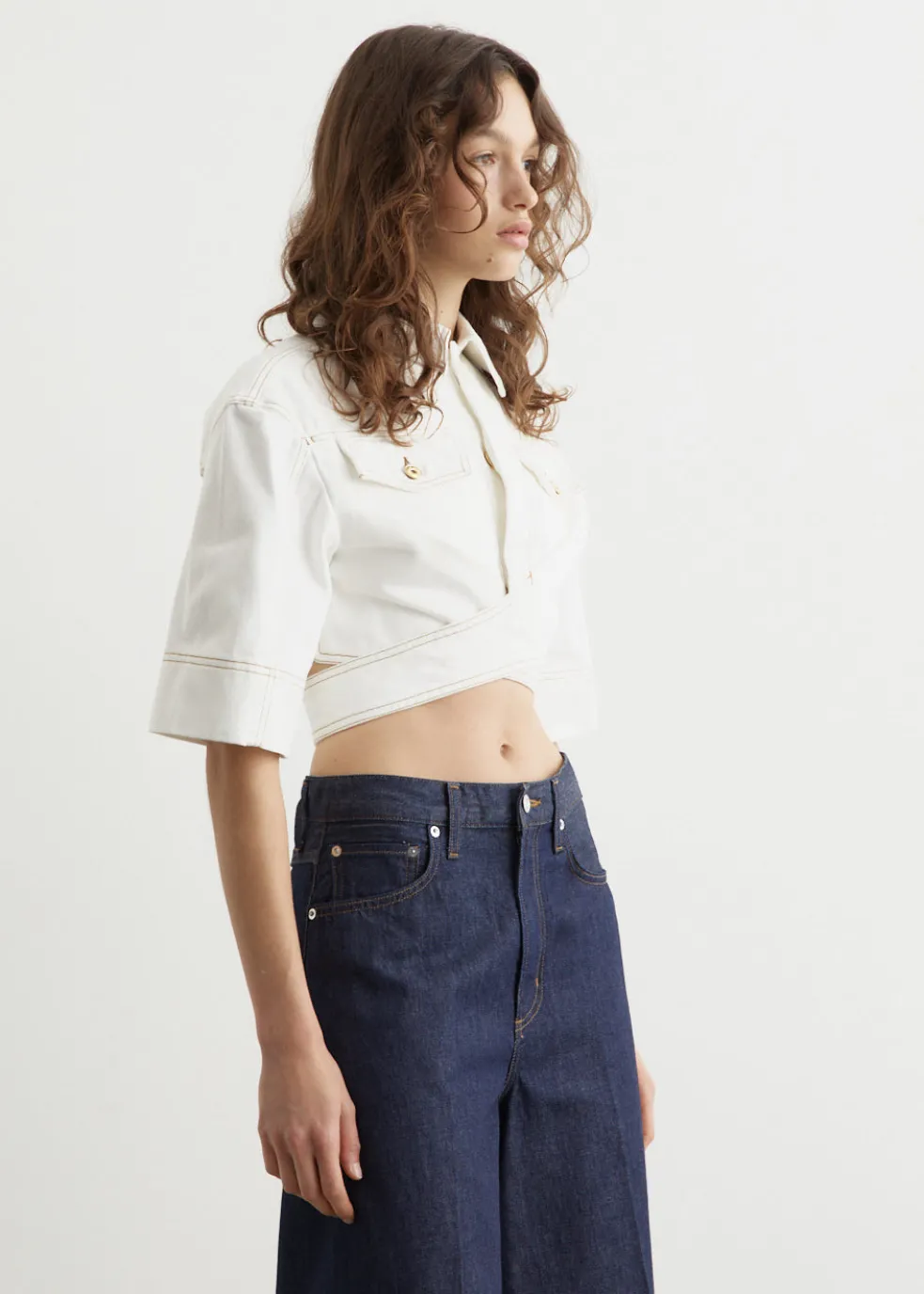 Vivacious and modernist French fashion-house, Jacquemus, can be described as a phenomenon. The brand’s accessories and ready-to-wear collections are consistently awe-inducing season after season. Made from denim, the Le Haut De-Nimes boasts a wrap top design with a cropped, boxy silhouette. It features a fitted waist that is accentuated by a wrap-around belt, which secures at the back with a metal buckle and studs.