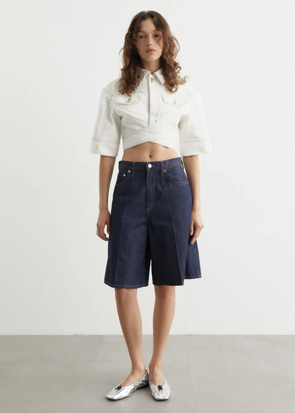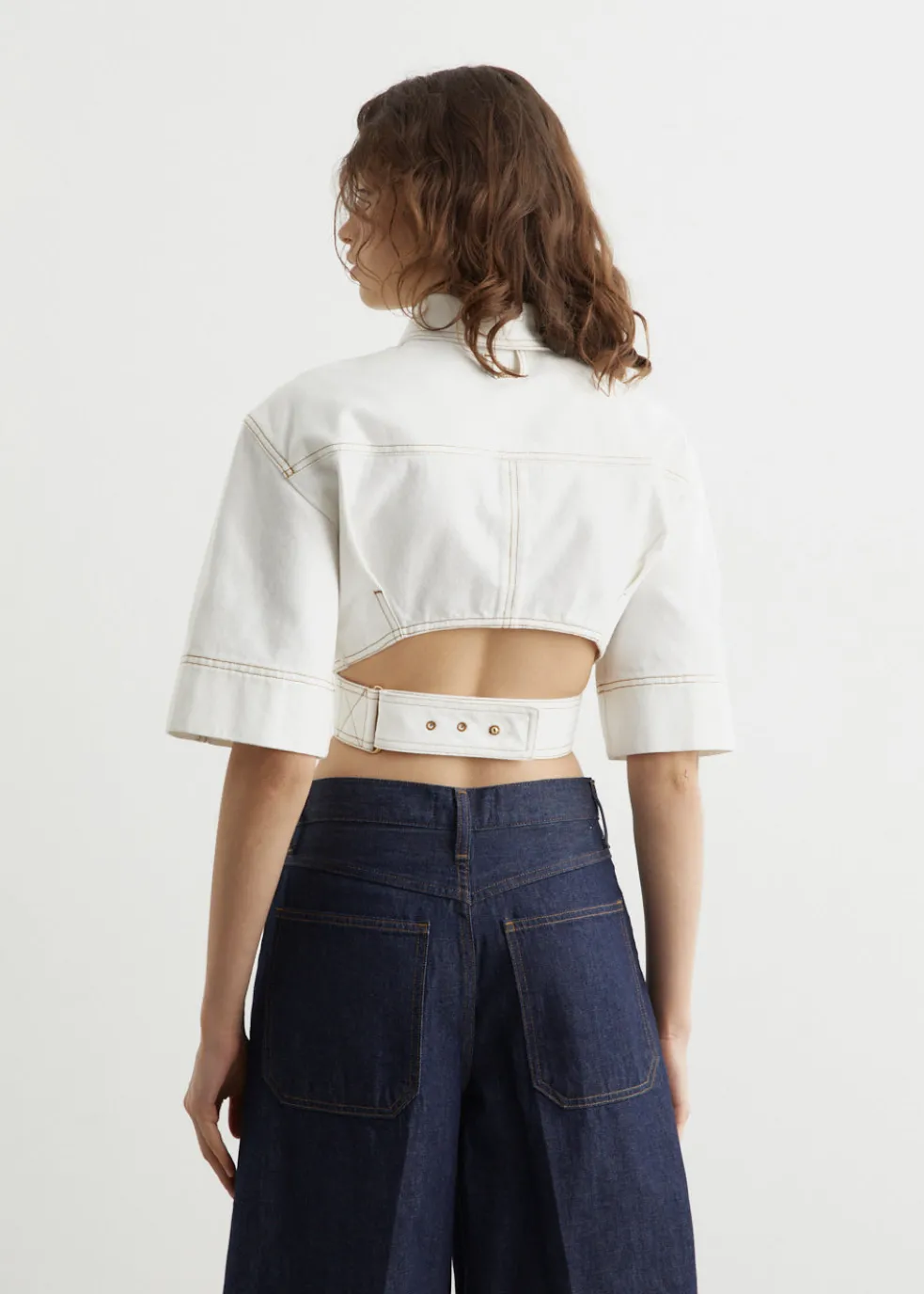 – Cropped, boxy fit with fitted waist