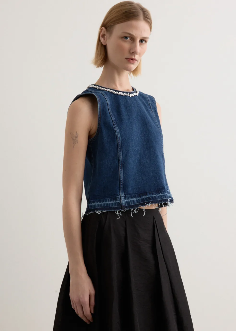 Brainchild of the designer duo Rikke Baumgarten and Helle Hestehave, Baum und Pferdgarten is the Danish label that blends modern feminine style with a playful sensibility. The Medine Top brings a touch of glamour to a wardrobe staple with its bejewelled neckline and clean, sleeveless silhouette. Cut from organic cotton denim, it features a relaxed, cropped fit that styles effortlessly with high-waisted skirts or jeans. A versatile piece that balances everyday ease with a polished edge.