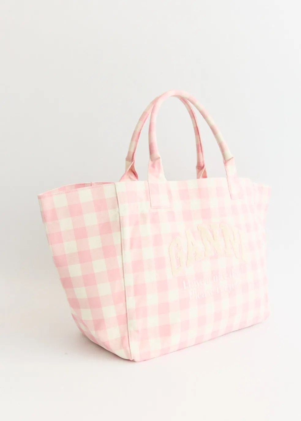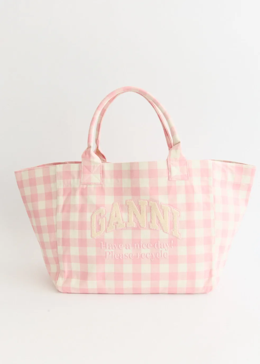 Danish label GANNI blends streetwear trends with a playful touch of humour through bold prints and colour palettes, voluminous silhouettes and easy-to-wear fabrics. Made from recycled cotton, the Shopper XXL Bag boasts an oversized shape with two handles and an embroidered logo and slogan at the front.