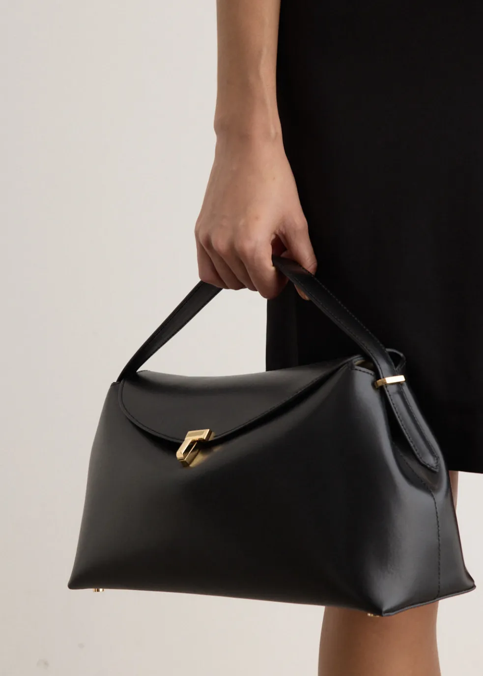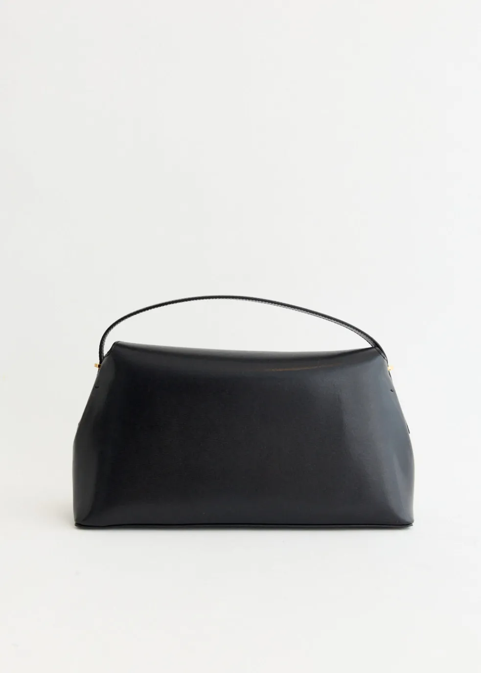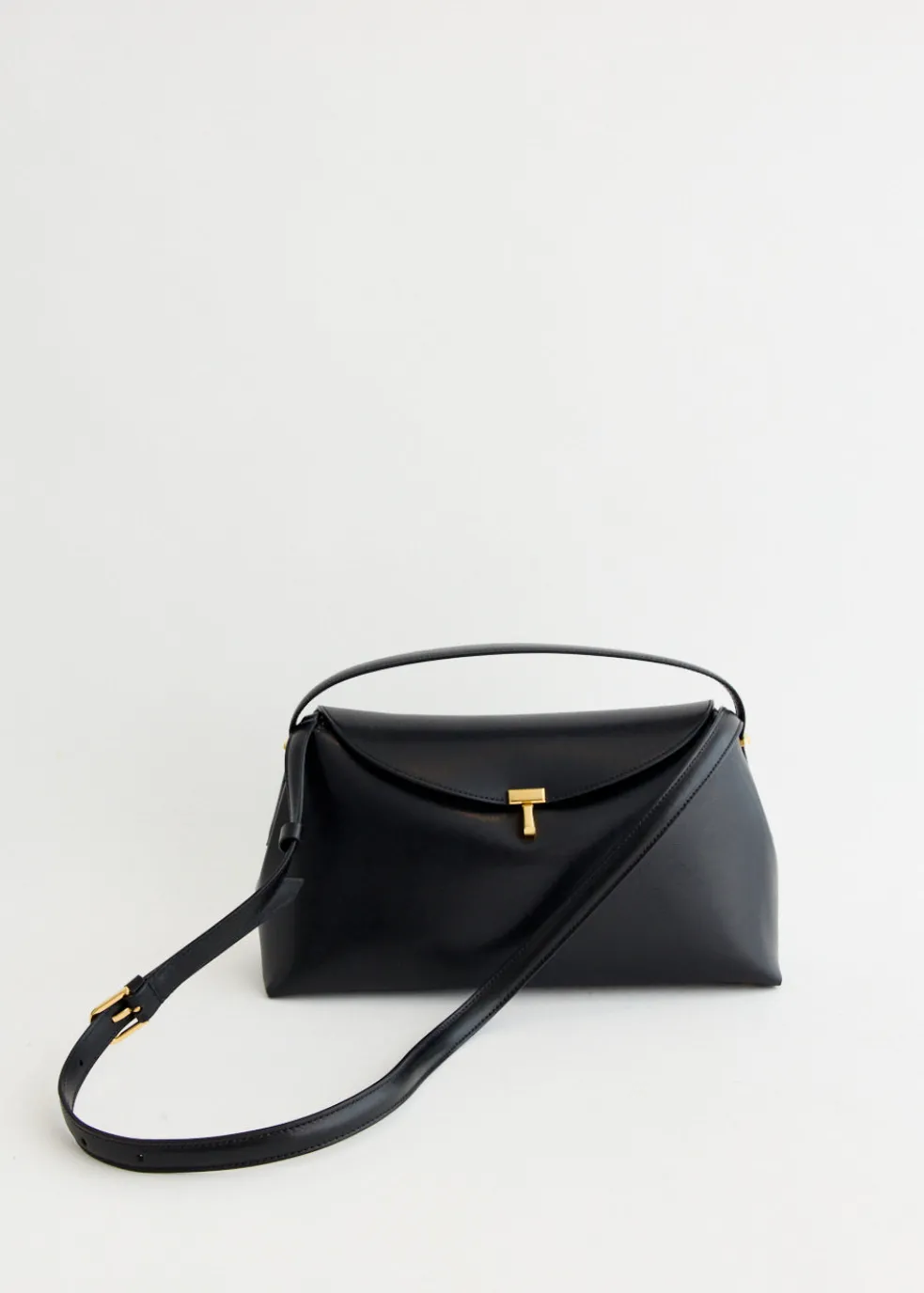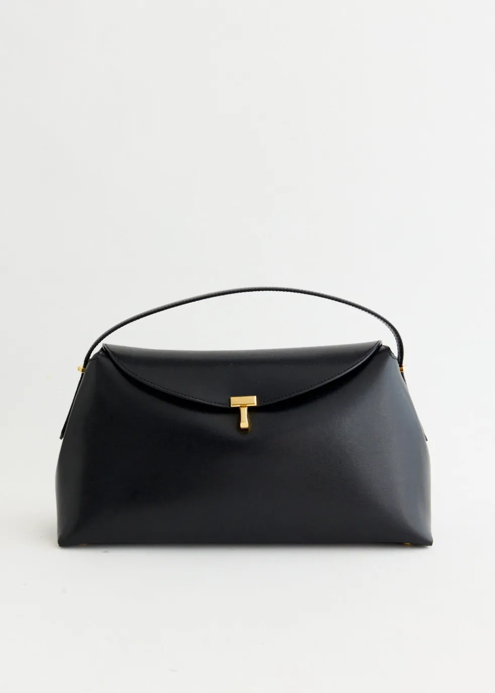 Founded in 2014 by Elin Kling and Karl Lindman,Toteme is a Stockholm-based brand renowned for crafting elevated essentials and timeless wardrobe foundations. Handcrafted from Italy with smooth leather, the T-Lock Top Handle Bag is sculpted with a curved top and is adorned with a golden metal T-shaped lock and protective feet at the bottom. Finished with a beige microsuede interior with two leather slip pockets.