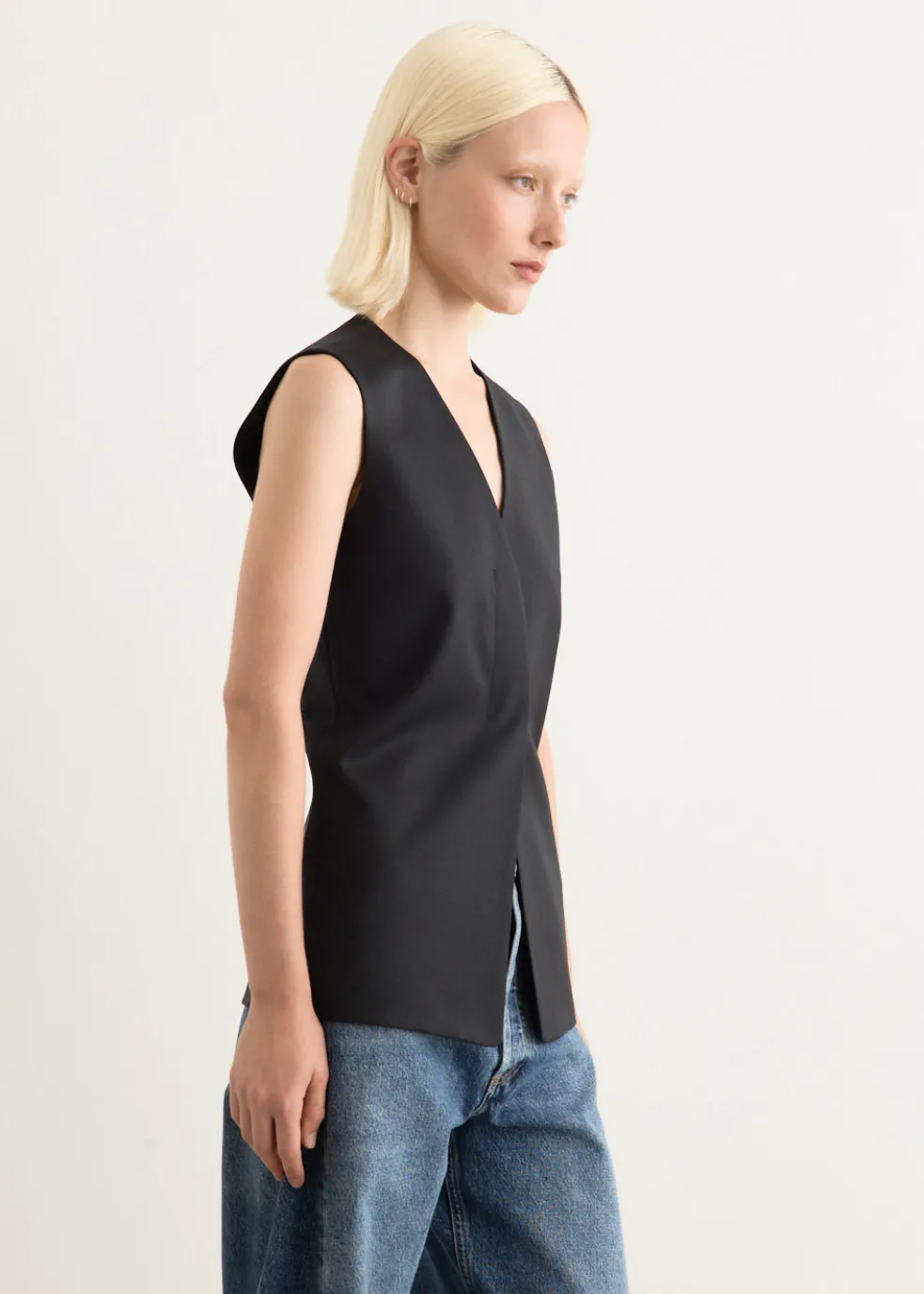 Birthed in Seoul, Low Classic’s philosophy revolves around beauty through simplicity and is delivered via updated, classic silhouettes. Crafted from a wool blend, the Waist Point Wool Vest boasts a sleek design with a v-neckline and a hidden button closure, making it ideal for standalone wear or layering.
