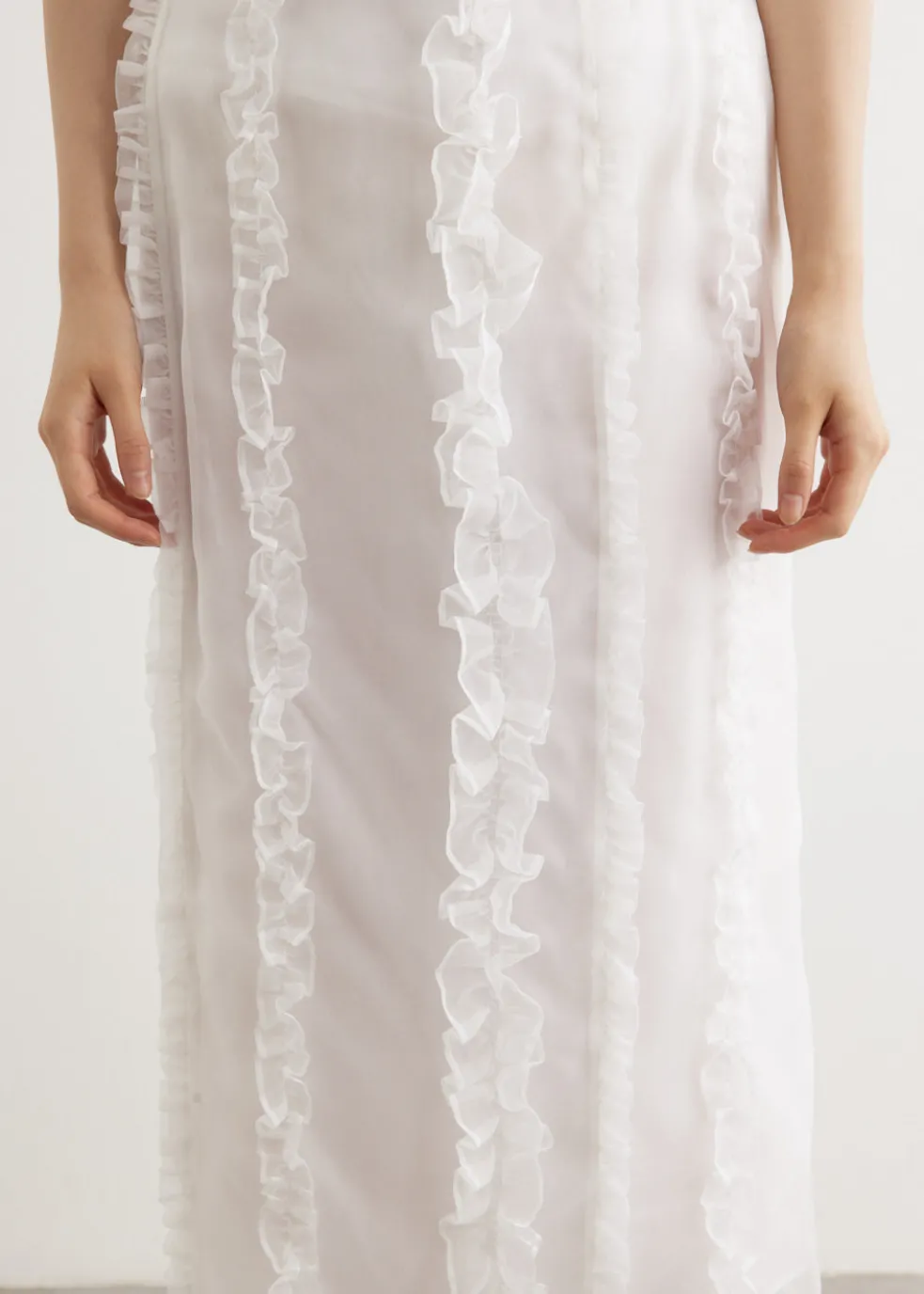 Cecilie Bahnsen partners with Nona Source to create a limited apsule collection, crafted from LVMH’s deadstock fabrics. The collaboration celebrates a shared dedication to sustainable design, reimagining iconic silhouettes and responsible craftsmanship. The Ocean Skirt is a sleek pencil skirt with cascading ruffles for added movement. Its flattering fit and back zip closure offer elegance and ease.